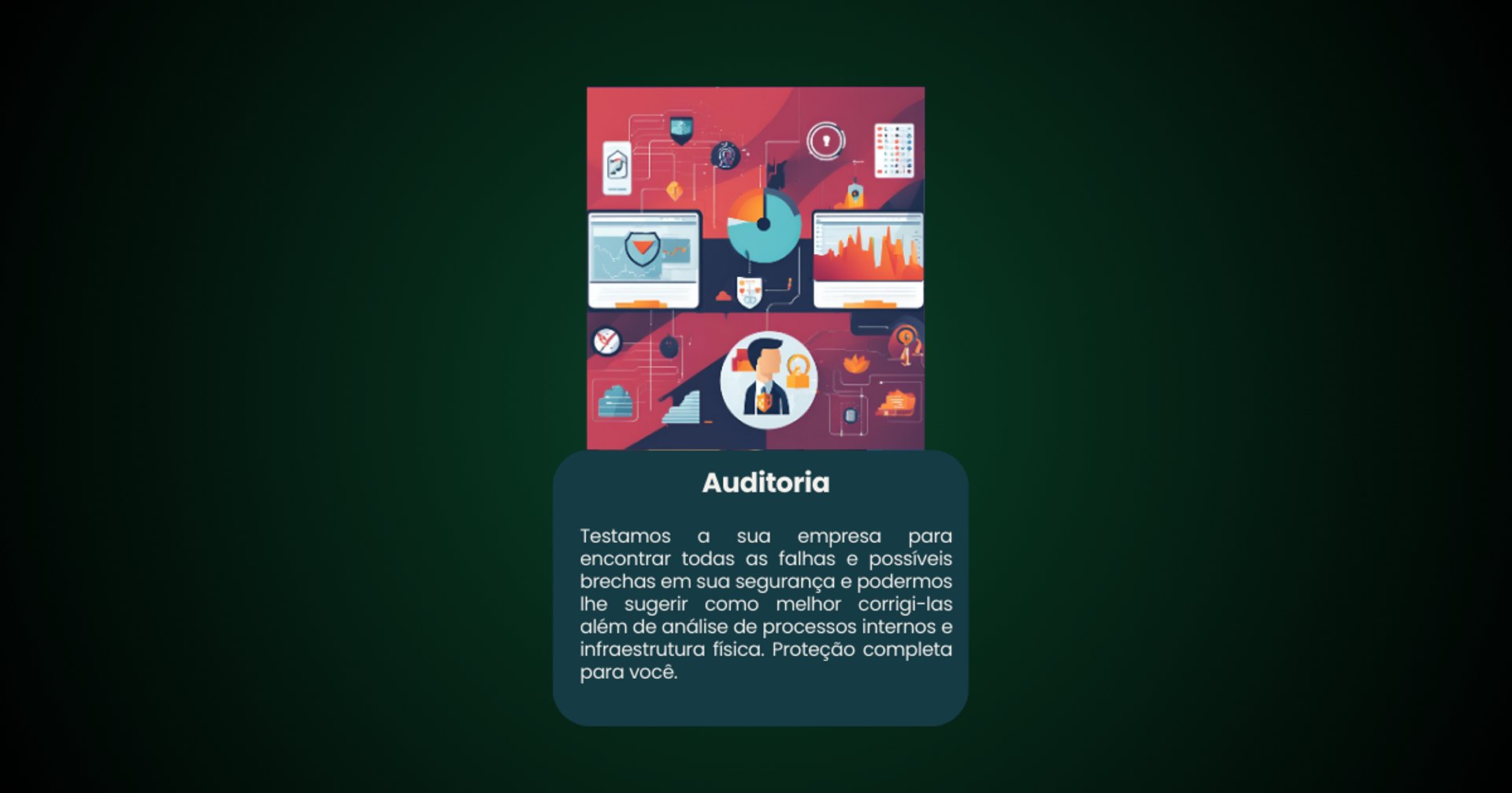 Testamos a sua empresa para encontrar todas as falhas e possíveis brechas em sua segurança e podermos lhe sugerir como melhor corrigi-las além de análise de processos internos e infraestrutura física. Proteção completa para você.